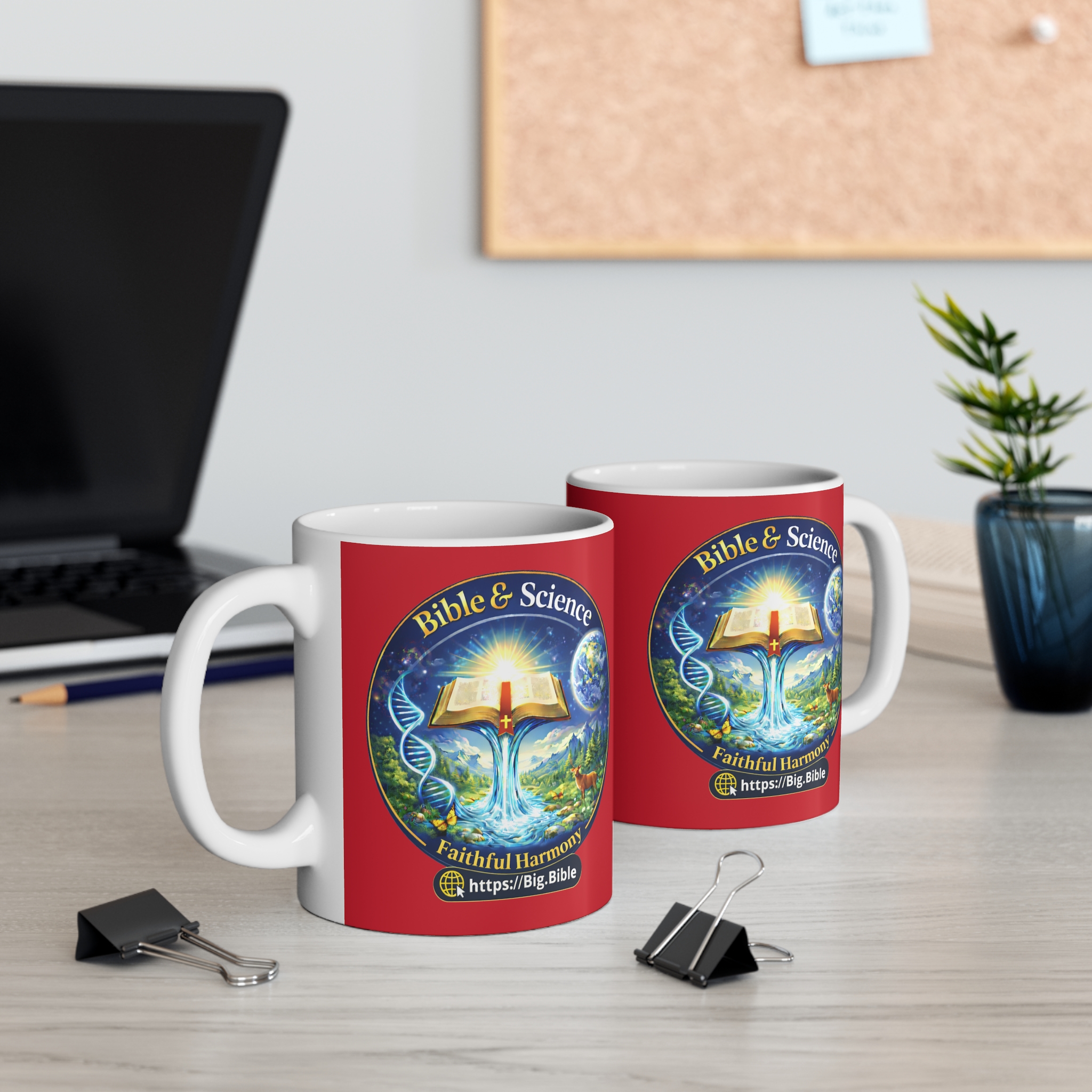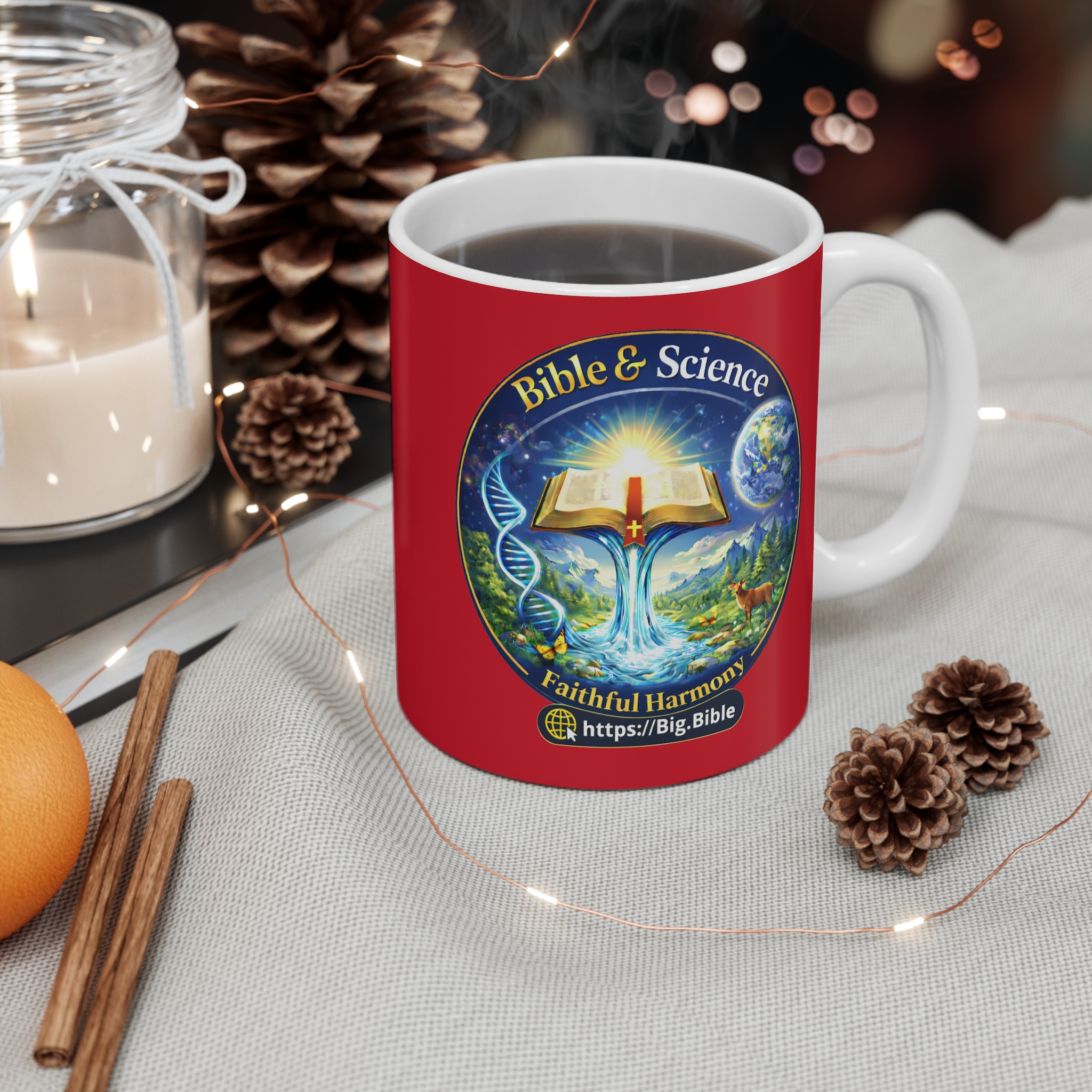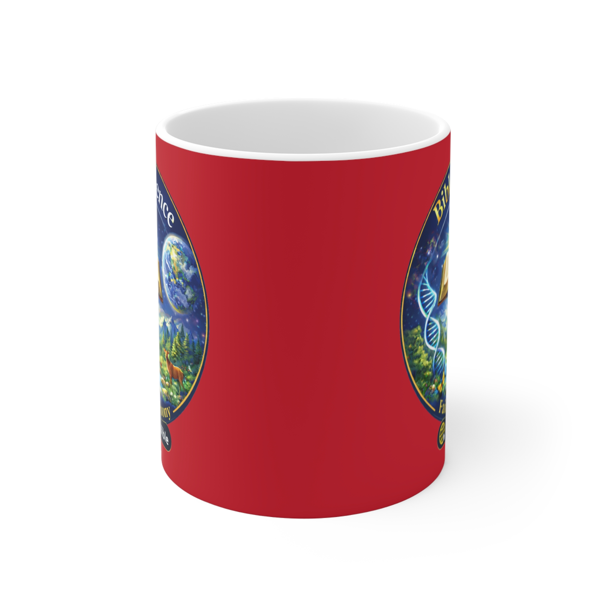 This mug is an uplifting reminder of the beautiful harmony that is found more and more between the Bible and science. These mugs hold 11 ounces (0.33 liters) of your favorite beverage with a vibrant emblem on a bright red background.