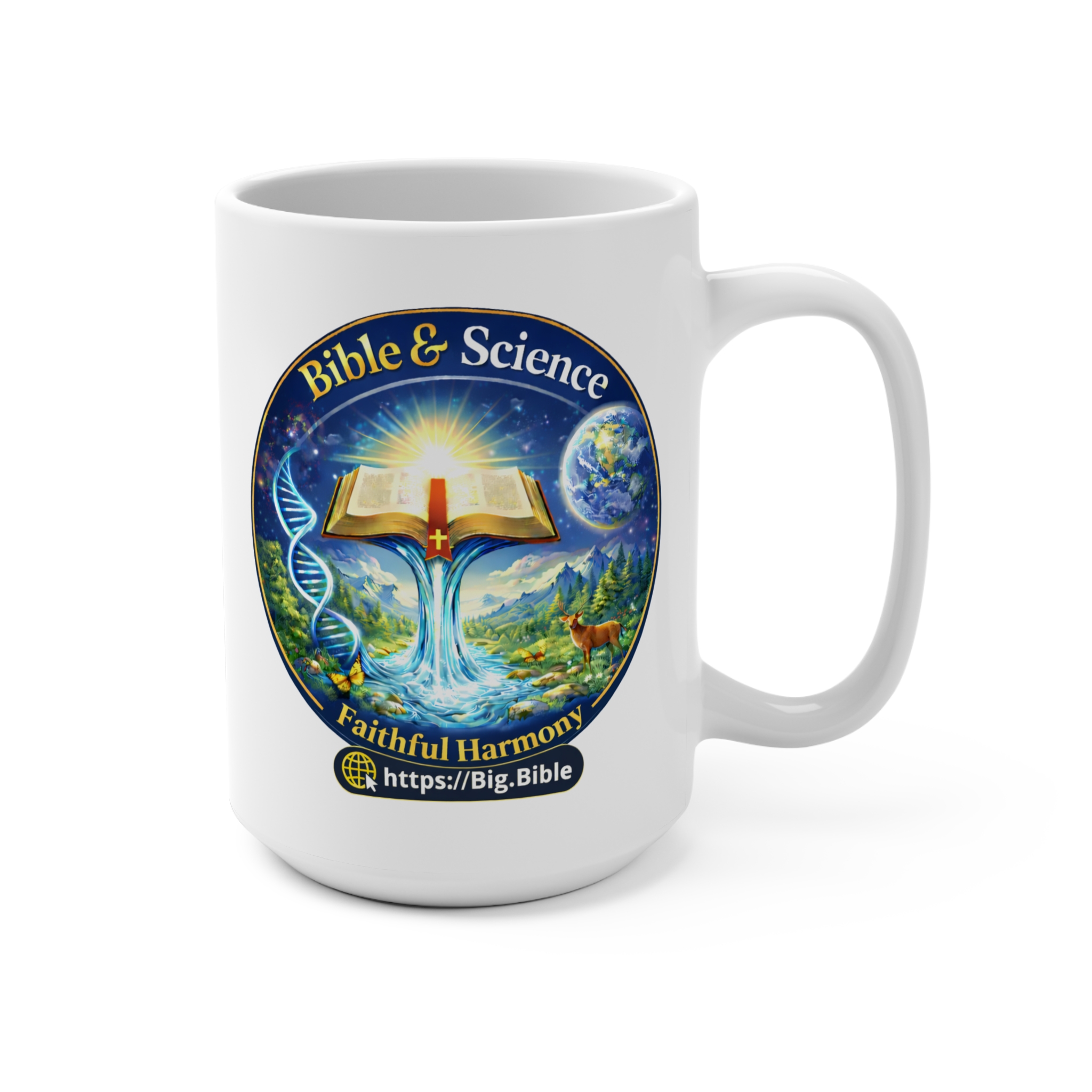 Hold a small, steady reminder of the harmony between faith and science each morning. This mug features a vibrant emblem that shows water flowing from a Bible that represents the living water that Jesus gives to those who believe in Him. Jesus who gives this living water is also the Creator, the source of all nature. This 11oz mug size feels familiar in hand; the rounded rim and C-handle make sipping comfortable during quiet study, prayer time, or a thoughtful pause between tasks. It’s made to live in everyday routines: safe for microwaves and dishwashers, free of lead and BPA, and bright enough to spark conversations about faith, science, and how the two can harmonize beautifully.